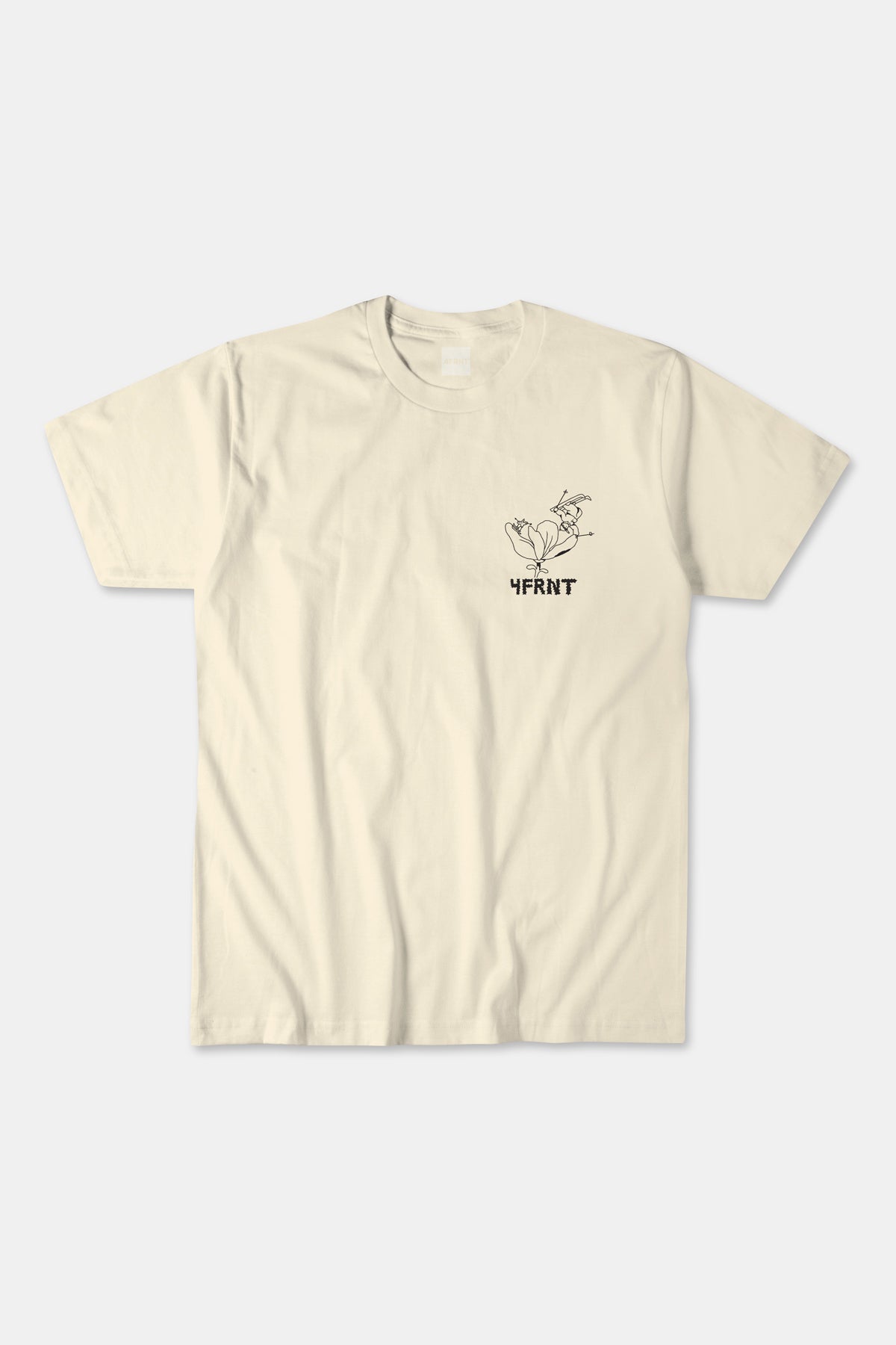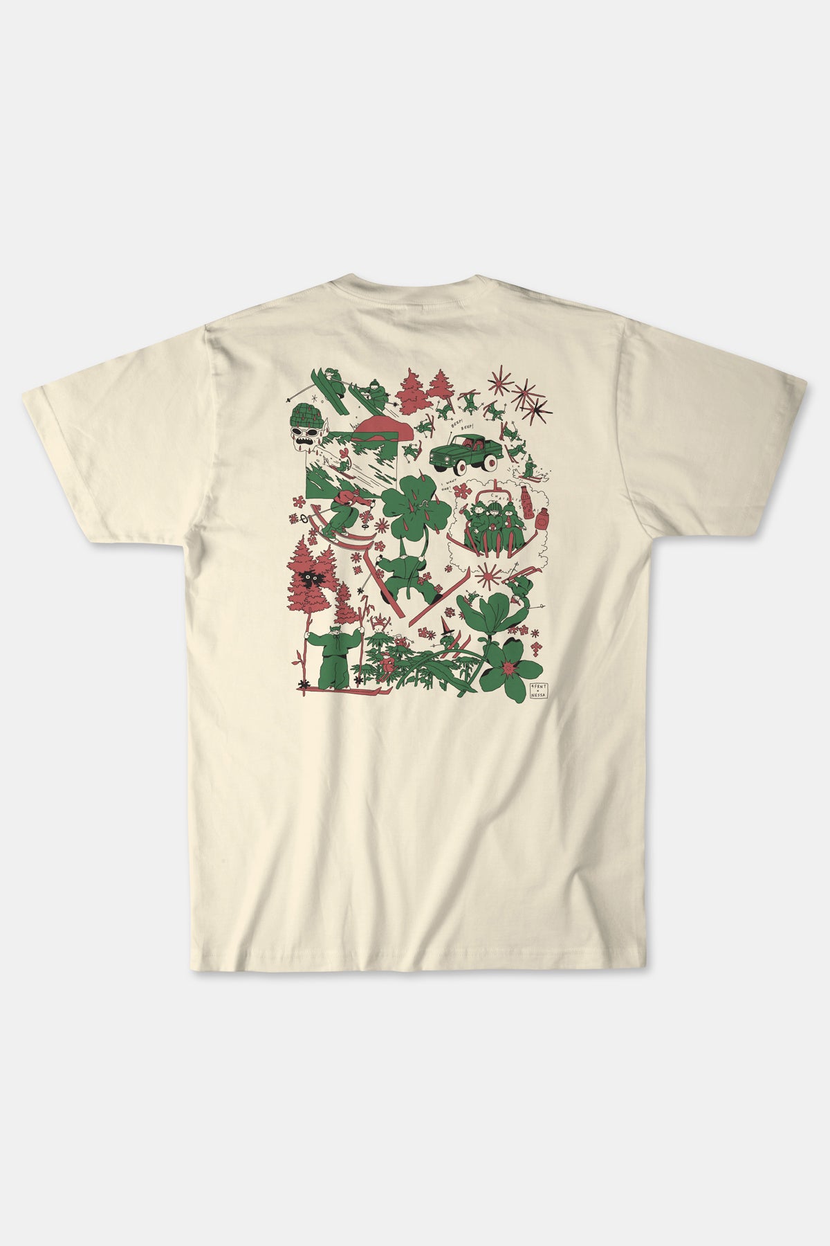 The Spring Skiing shirt includes a small front logo, and a larger back design, both created by Nessa. Printed on a light cream tee.